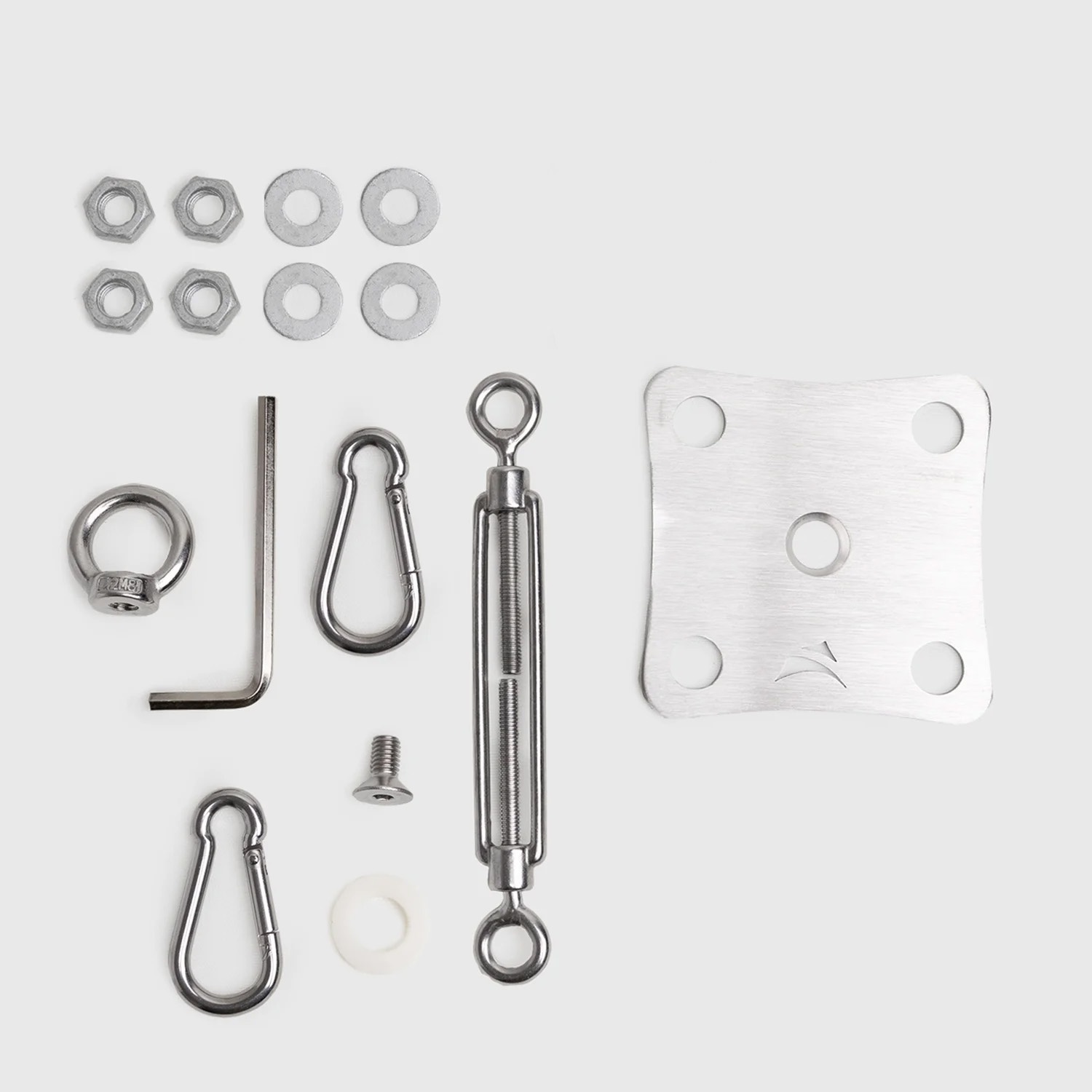 Le tendeur et les deux mousquetons pourraient être proposés en diamètre de 8 mm pour parfaire le caractère de robustesse de l’ensemble, car la plaque carrée inspire la robustesse Lire plus Lire moins
