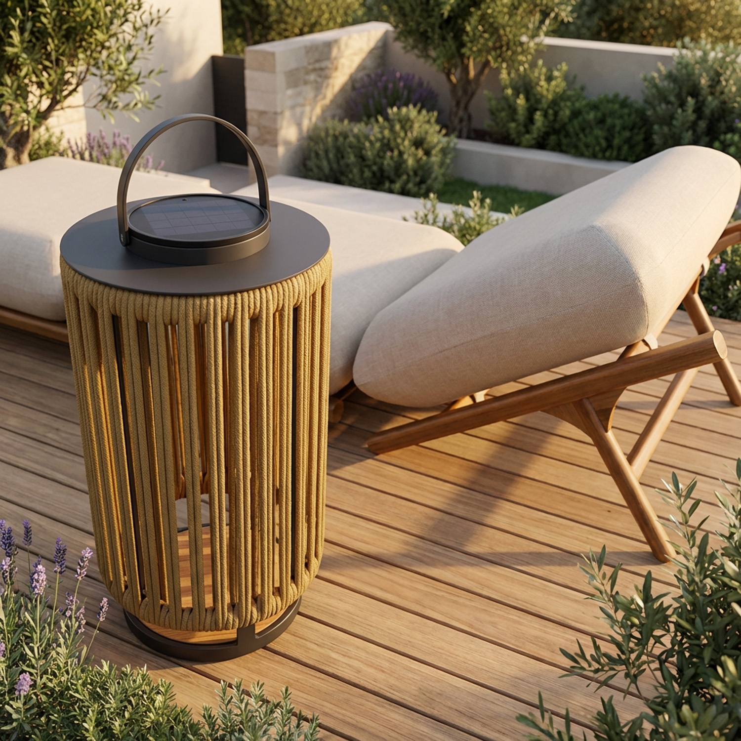 Marinea est une lampe solaire extérieure portable avec corde en nylon tressée à motif radial et base en teck.