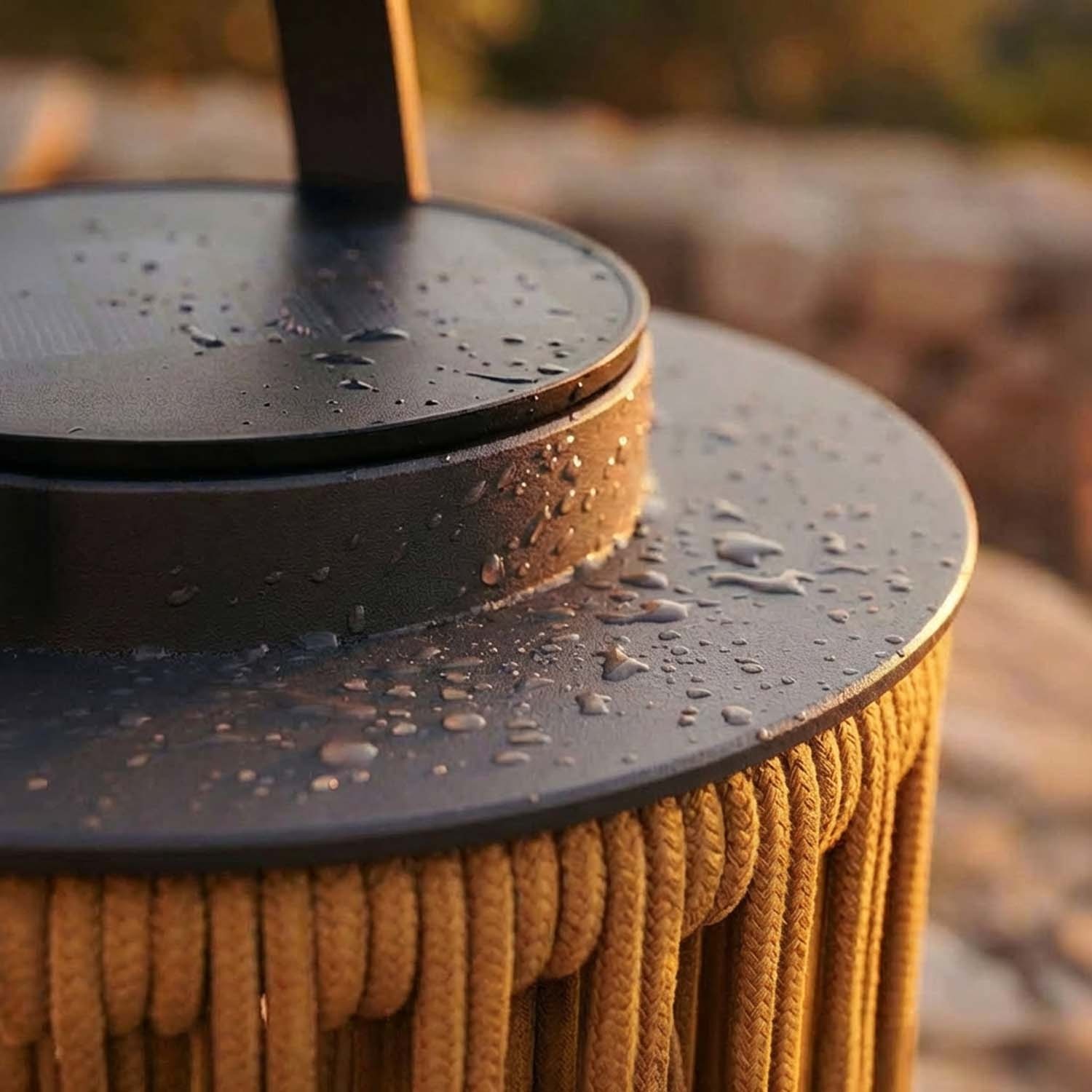 La corde en nylon est tressée selon un schéma radial précis. Lorsque la LED s'allume, chaque rayon de lumière qui filtre entre les cordes dessine un motif en étoile sur les surfaces environnantes : la table, le mur, le sol de la terrasse. Ce n'est pas un effet aléatoire. C'est la géométrie appliquée à l'éclairage.