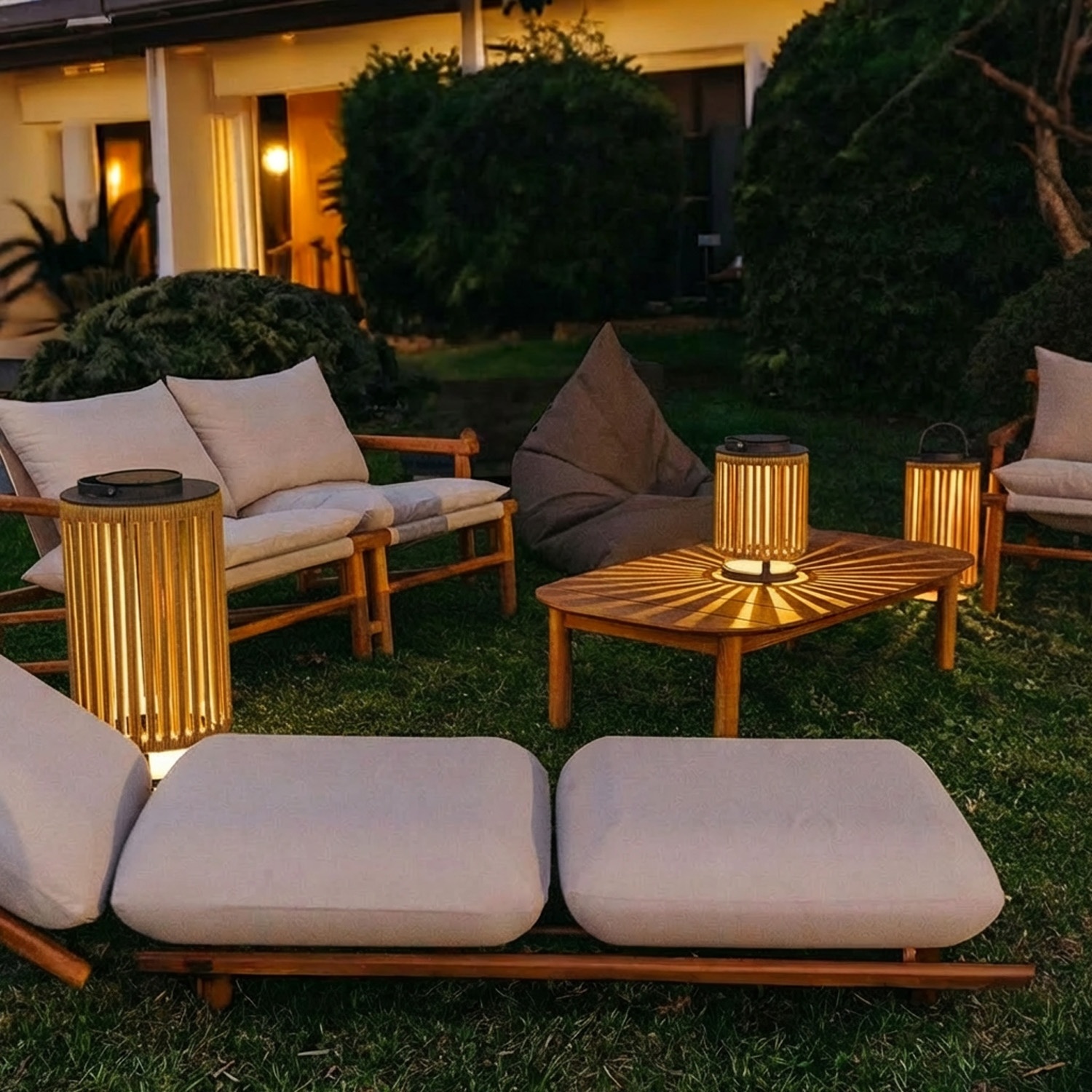 • Ombres radiales étudiées : la corde tressée crée un motif lumineux qui transforme l’espace extérieur
