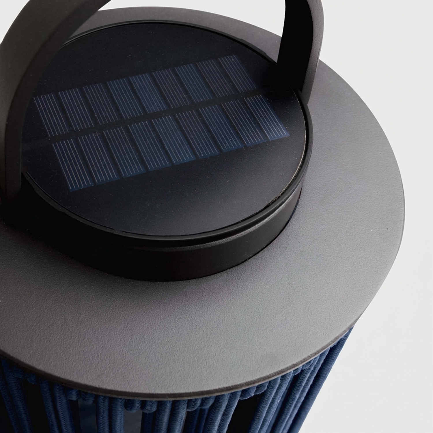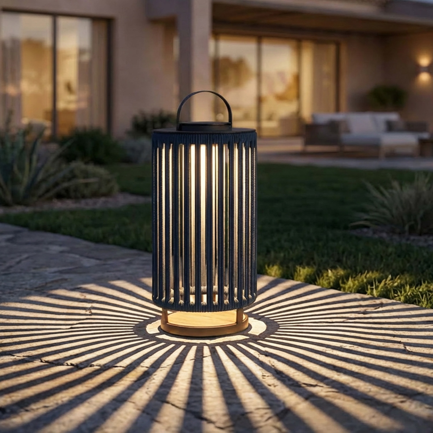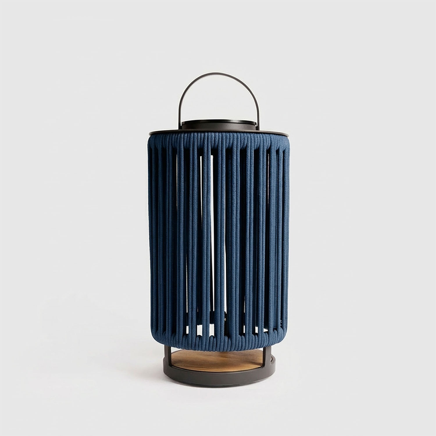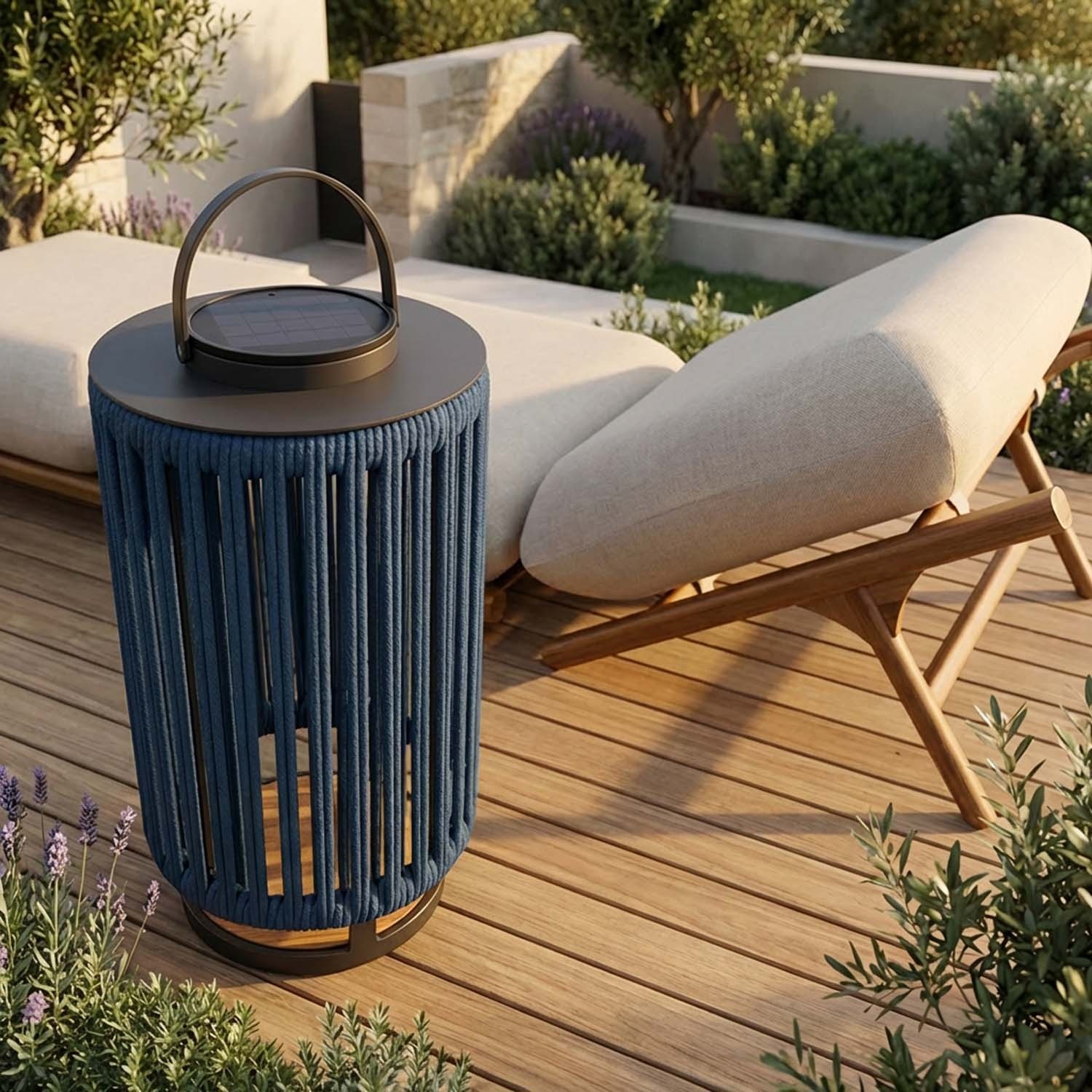 Marinea est une lampe solaire extérieure portable avec corde en nylon tressée à motif radial et base en teck.