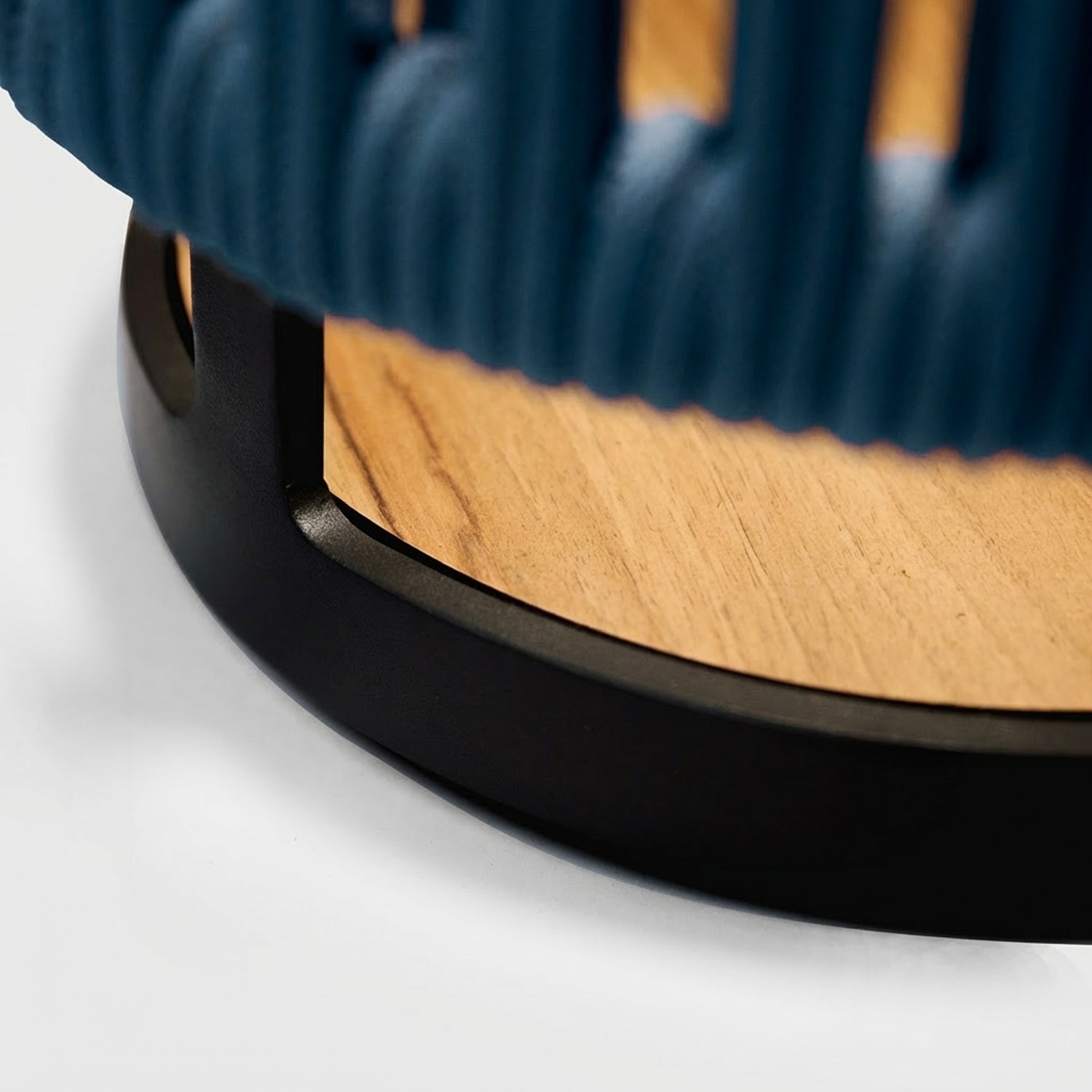 La corde est disponible en quatre couleurs : Terracotta, Dark blue, Pebble grey, Olive beige. La structure en aluminium est toujours noir mat. La base en teck a une couleur naturelle.