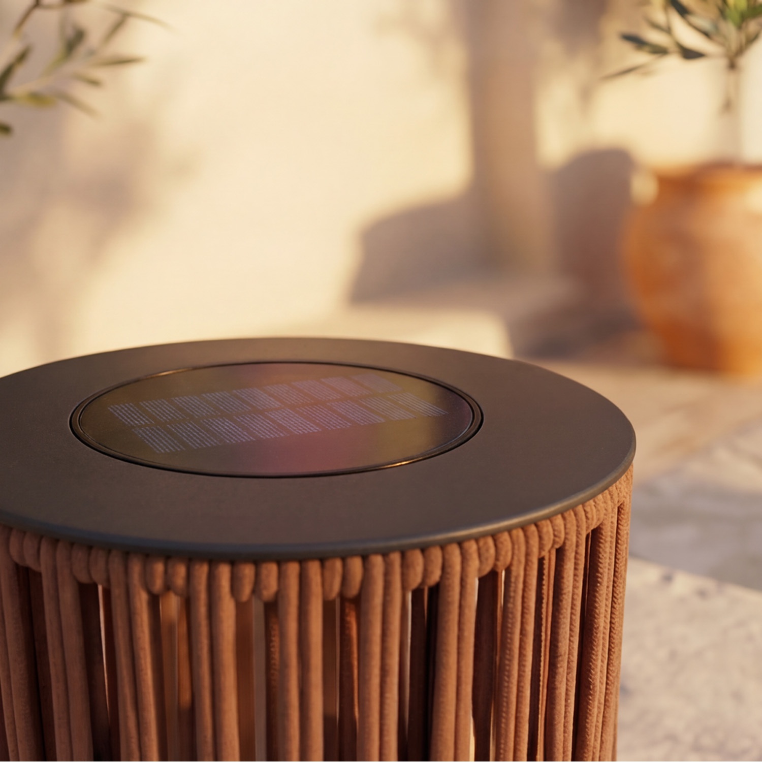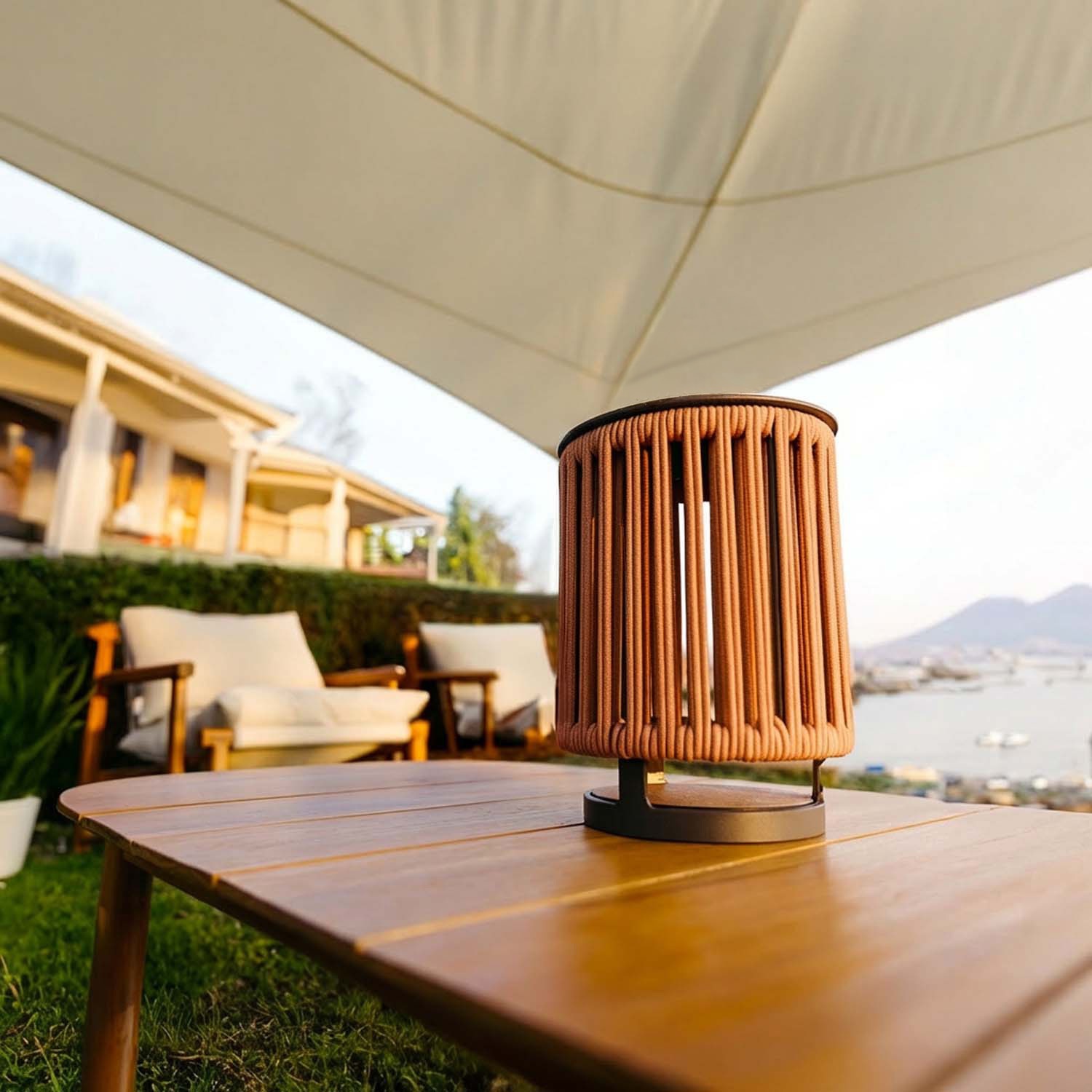 Elle n’a pas de poignée : c’est un choix de conception. La base est pensée pour rester bien en place, soir après soir, sur des marches, des murets ou des jardinières. Lorsqu’elle s’allume, la corde filtre la lumière et projette des lignes d’ombre linéaires et rythmées sur les surfaces autour.