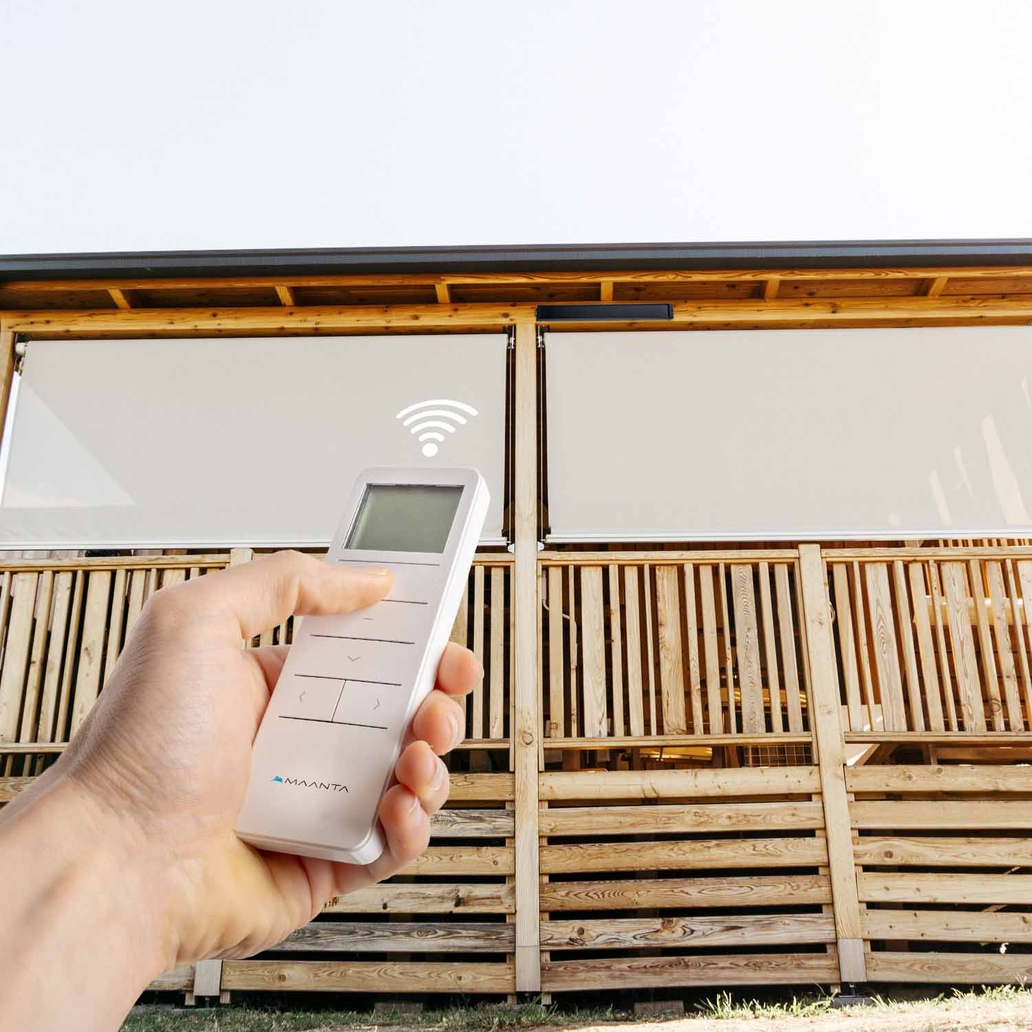 Le store se contrôle par télécommande ou application. Le moteur fonctionne en 12 volts avec batterie lithium intégrée, rechargeable via USB/USB-C. Aucun électricien ni câblage mural nécessaires.