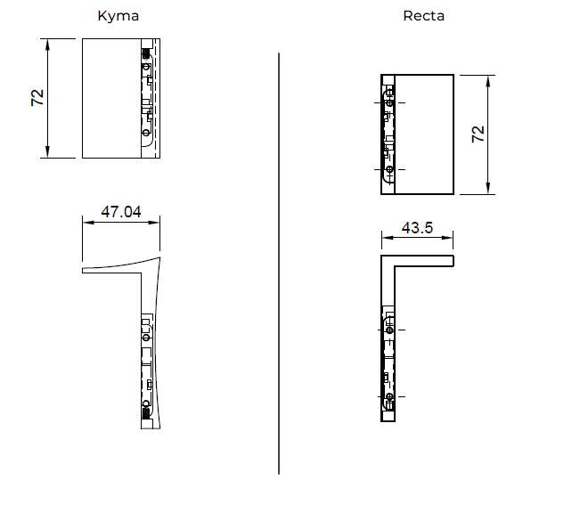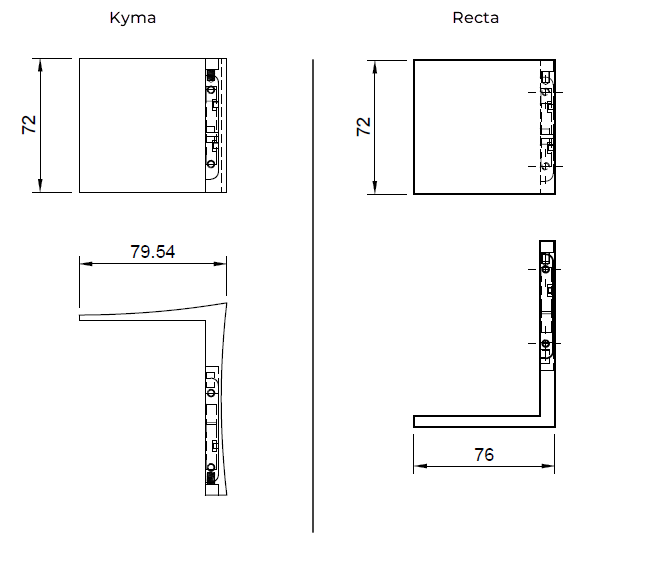 Kyma et Recta sont identiques à tous points de vue, sauf pour le design de la plaque décorative. Recta présente des lignes géométriques et épurées pour ceux qui aiment l’essentiel, tandis que Kyma se distingue par un profil aux formes douces et ondulées. Les performances, les tissus, les dimensions et les prix sont identiques.