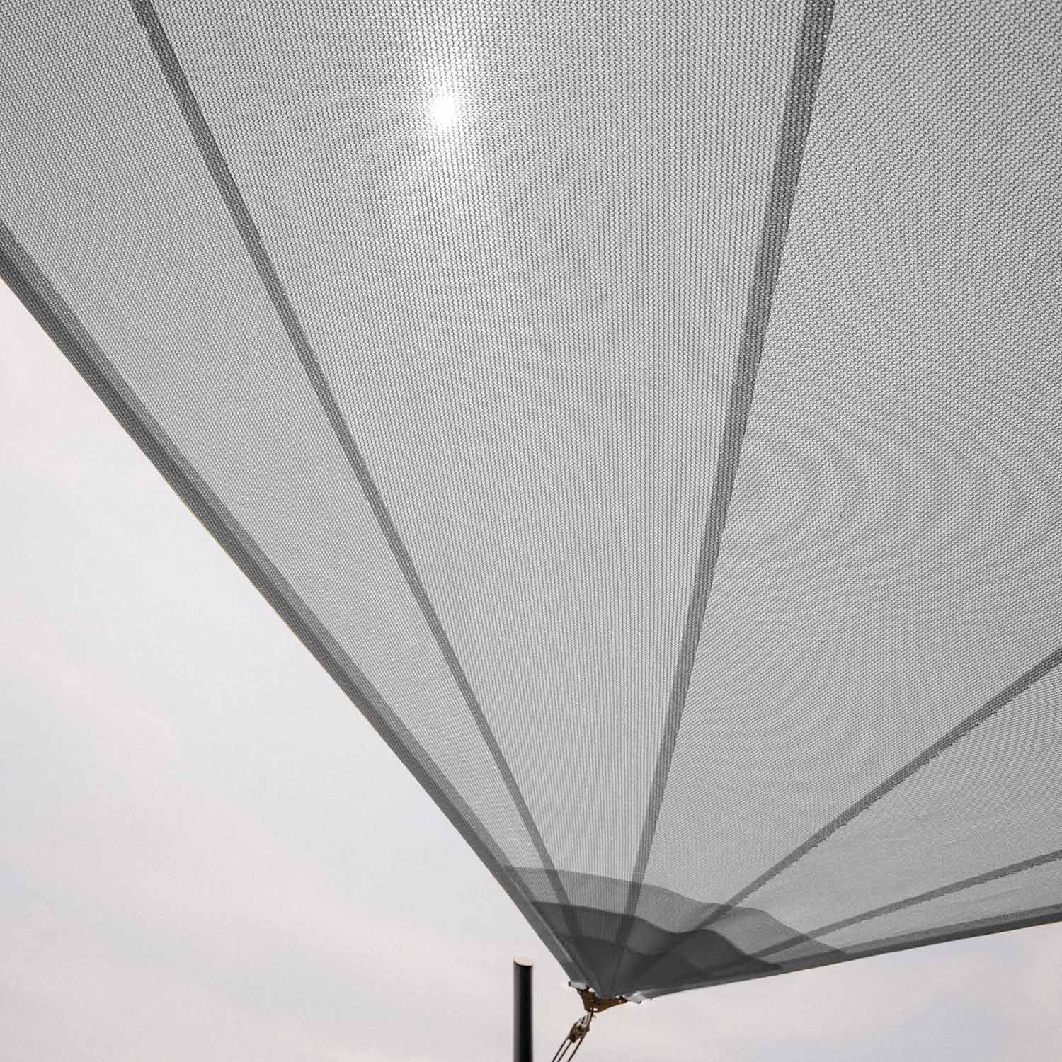 Solaria Ajourée est une voile d'ombrage avec coupe radiale fabriquée en tissu Meshnet® HDPE 320 respirant qui protège contre la chaleur intense et la grêle, ainsi que contre les rayons UV et le vent fort.