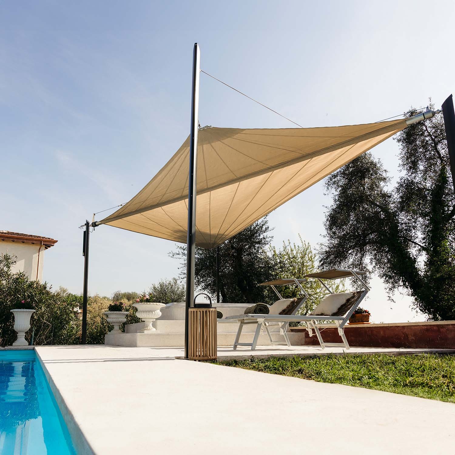 Cette voile d’ombrage motorisée nécessite des mâts spécialement conçus par Maanta, avec des platines adaptées à son système de fixation motorisé. Si vous avez déjà d'autres mâts, ils ne seront malheureusement pas compatibles avec Zefira.